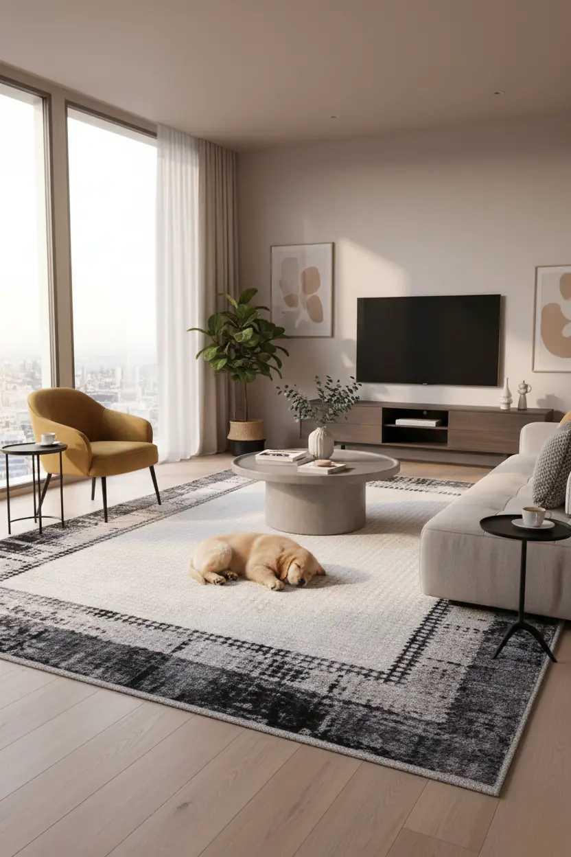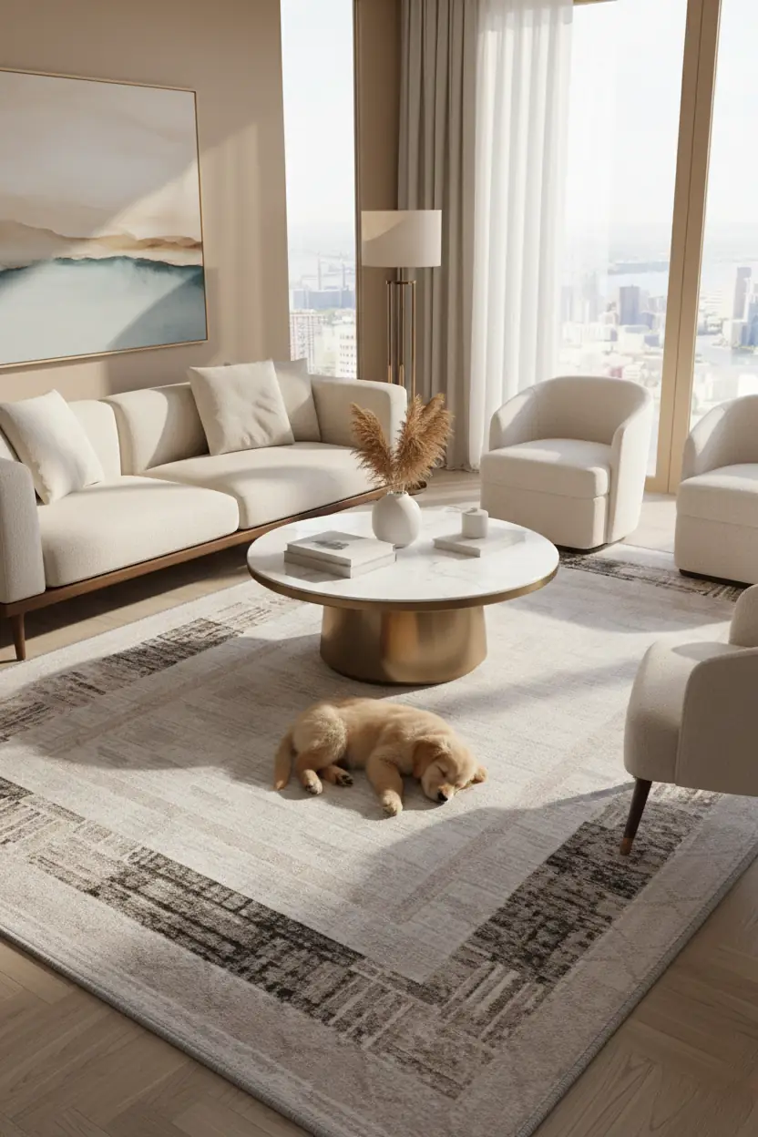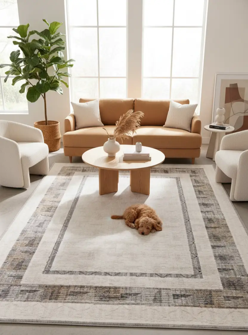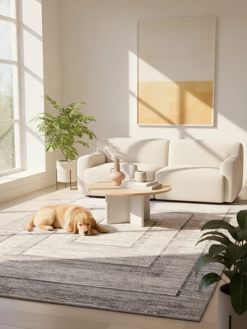 Patili Dostlarımızın Konforu: Halı Seçimi Neden Önemli? Görsellerimizde de gördüğünüz gibi, sevimli dostlarımızın salonun tam ortasında, halının üzerinde şekerleme yapması tesadüf değil. Onlar için yerdeki doku, evin en güvenli ve sıcak limanıdır. Anatolian Carpet Store koleksiyonunda yer alan kısa tüylü, kolay temizlenebilen ve dayanıklı modern halılar, hem sizin göz zevkinizi korur hem de evcil hayvanlarınızın tırnaklarına veya enerjisine karşı direnç gösterir.