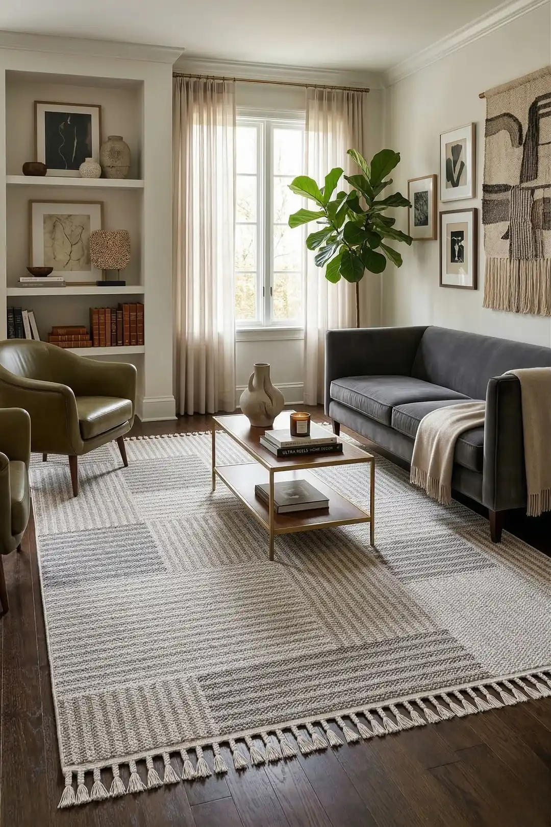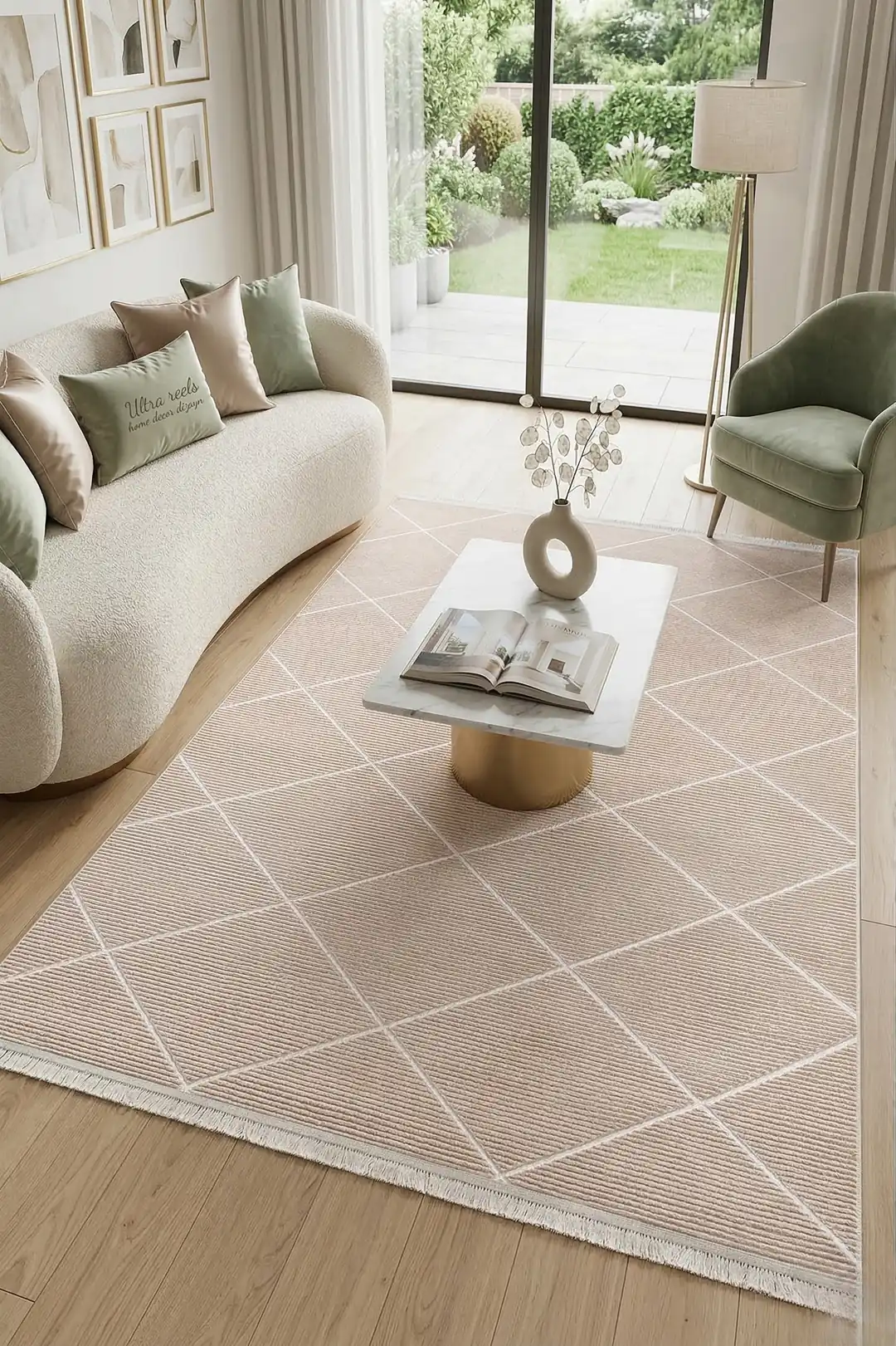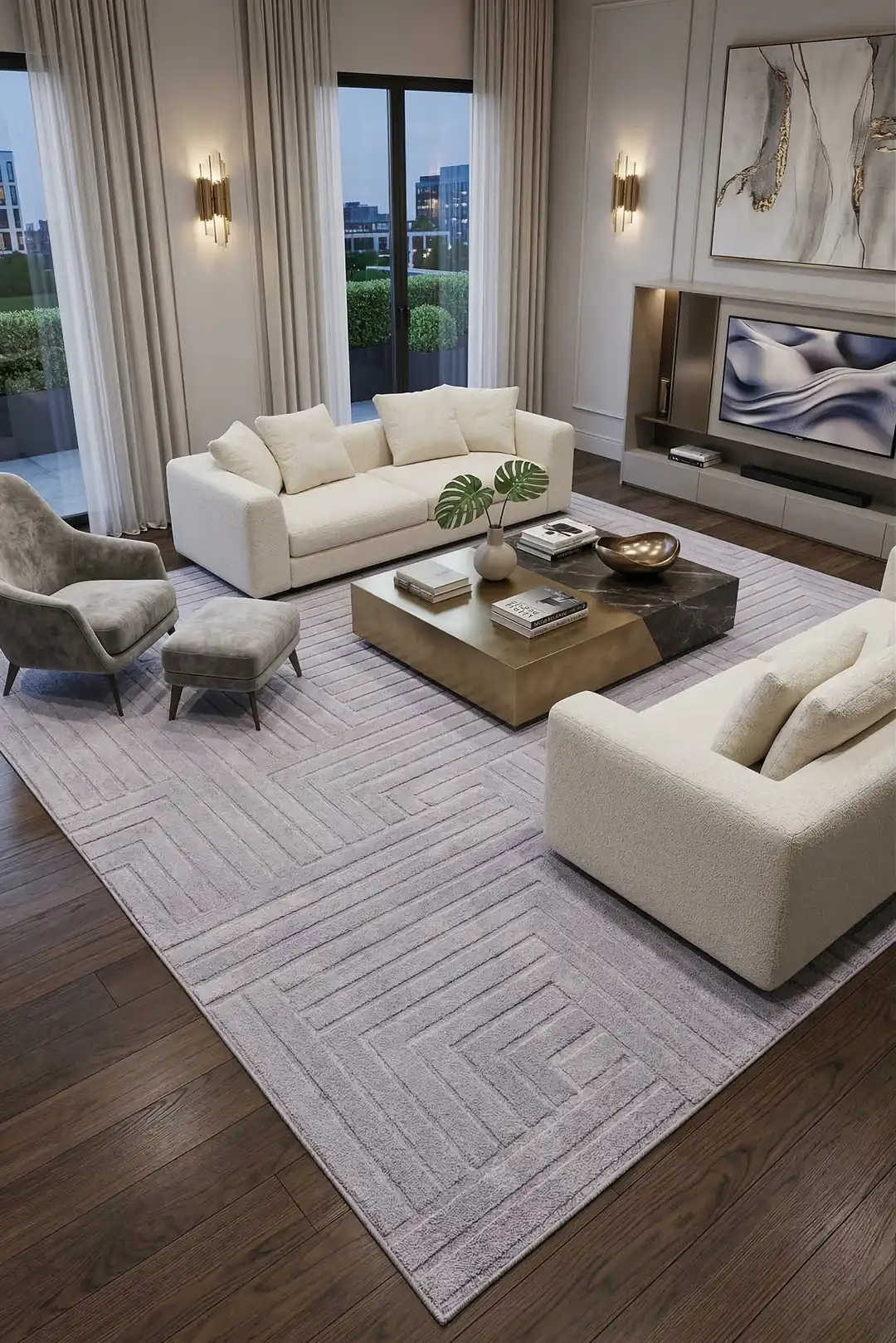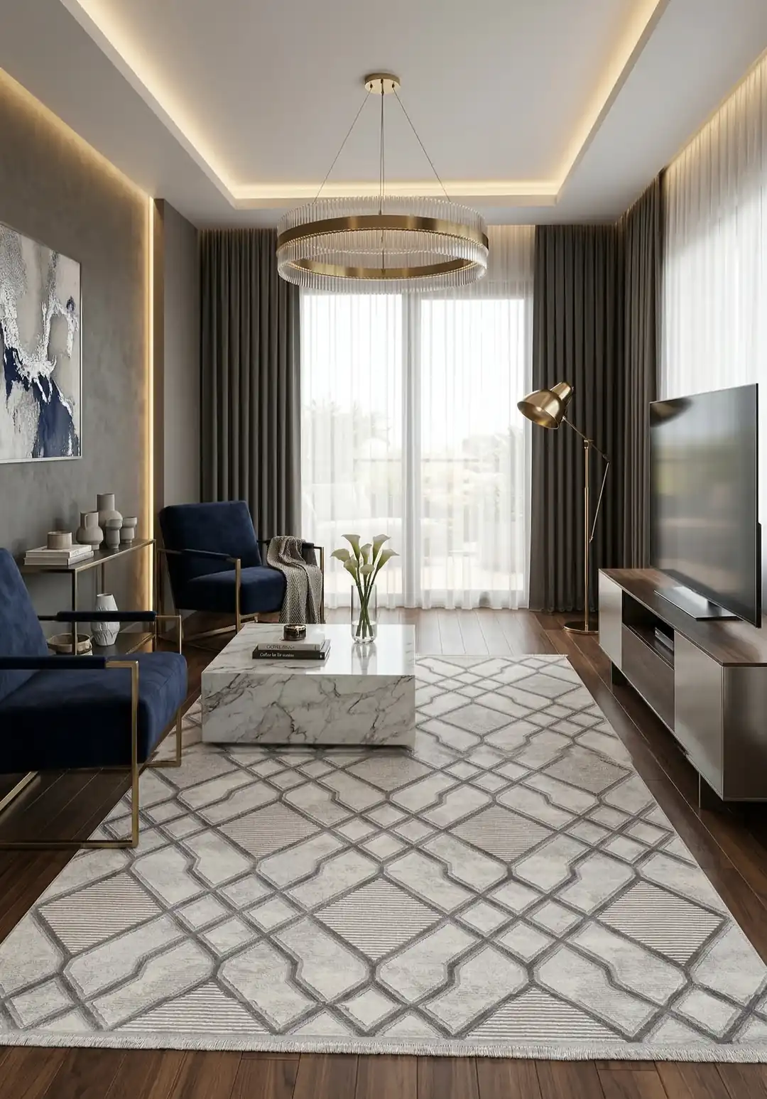2. Materyallerin Diyaloğu: Mermer, Metal ve Dokuma Lüks bir oturma odasında eşyalar birbirini tamamlamalıdır. Mermer bir orta sehpanın soğukluğunu, altına sereceğiniz yoğun dokulu ve yumuşak tuşeli bir halıyla kırabilirsiniz. Metal ayaklı mobilyalarla bütünleşen geometrik ama sade hatlı halılar, mekanın mimari bütünlüğünü mühürler. Bu, göze çarpan değil, ruhu dinlendiren bir şıklıktır.