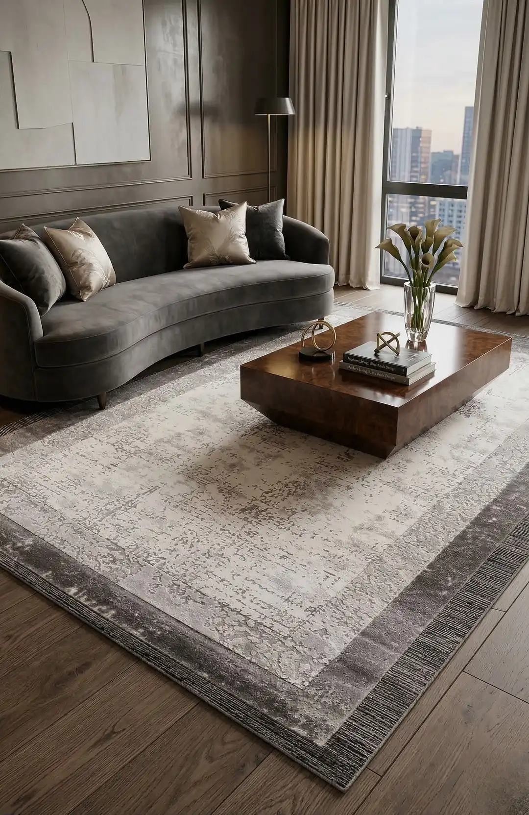 1. Monokrom Şıklık: Antrasit ve Grinin Asaleti Görsellerimizde de hakim olan antrasit, füme ve gümüş gri tonları, modern lüksün vazgeçilmez paletidir. Anatolian Carpet Store’un premium koleksiyonundaki bu derin tonlar, mekana anında bir "malikane" havası katar. Tek renk (monokrom) bir halı seçmek riskli gibi görünse de, liflerin arasındaki o ipeksi parlaklık ve doku geçişleri, odaya zengin bir görsel derinlik kazandırır.